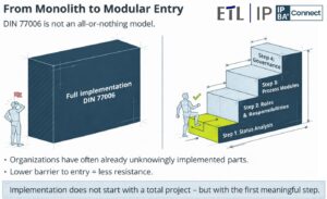 This logic was then expanded beyond DIN 77006. Many IP themes share the same challenge. They are explanation intensive, organisationally relevant, and initially hard to grasp. Therefore, they require context, interpretation, and a modular entry. The presentation’s strategic synthesis was excellent: a new IP topic needs context, not only technical explanation; it needs a manageable entry, not a giant project; and it needs visible proof that theoretical work can produce measurable operational relief.