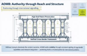 His case examples made this highly tangible. Bardehle Pagenberg stood for authority through explanation. EIP illustrated authority through participation in the relevant ecosystem. Plougmann Vingtoft showed authority through business relevance, translating IP into the language of growth and investment decisions. AOMB represented authority through structure and international signalling. These examples helped the audience see that there is no single formula for success. The right model depends on the source of authority a firm can credibly own.
