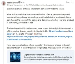 The examples you shared make this visible. In one post, a regulatory expert discusses how a single word such as “patient” can alter the standards scope for veterinary devices. The reply does not drag the discussion away from regulation. Instead, it adds an IP perspective by pointing out that small wording shifts can also redefine claim scope and protection strategy, then connects that idea to a digital IP lexicon 🧭dIPlex resource on digital transformation in MedTech. In another MedTech discussion, the comment links software compliance thinking with patentable software elements in medical devices. In the German examples, a debate about “projectification” is connected to Max Feucker’s work on IP Process Management, and a post about organizational debt is translated into a question about hidden debt inside innovation and IP-related processes.