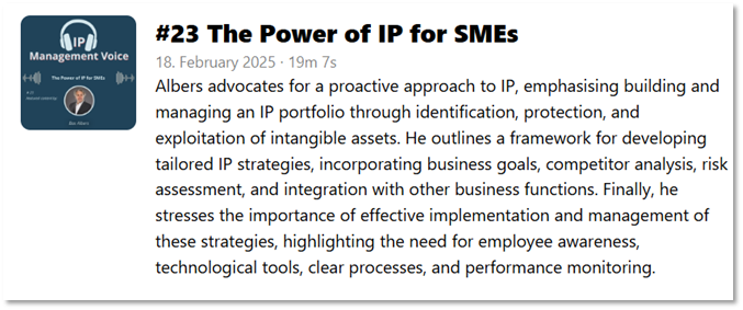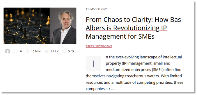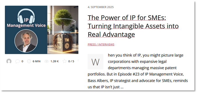 The human dimension of that brand is reinforced through conversations. Episode #23 of 🎧IP Management Voice brings Bas’s voice directly to the audience. His style is practical and realistic, with empathy for companies working under limited resources. This isn’t detached theory; it is lived practice, shaped by experience, and voiced in terms any manager can relate to.