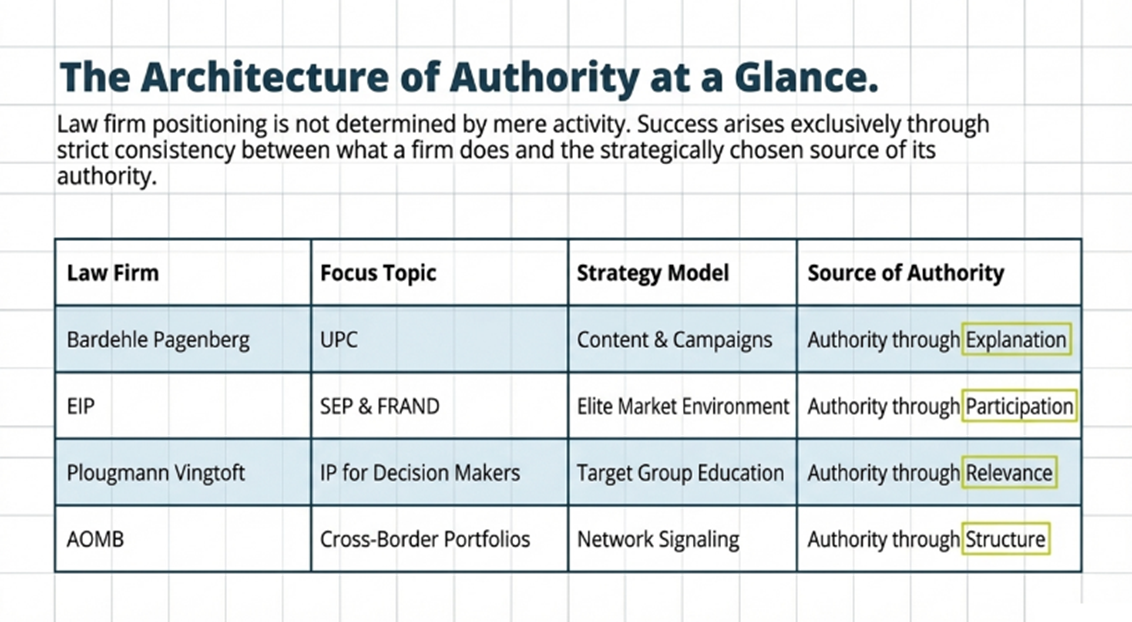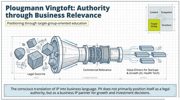 Some firms build authority primarily through content. They become known because they explain a complex field better than others and do so repeatedly. Some firms gain visibility through ecosystem presence. They are perceived as close to the relevant market environment, the critical players, and the conversations that shape outcomes. Others stand out through target-group relevance by translating IP into the business language of a specific audience. Still others create authority through structure by signaling reliability, international coordination, and repeatable delivery capacity.