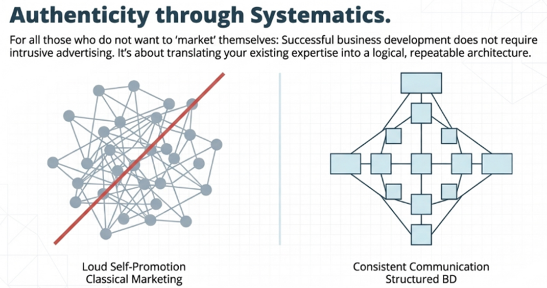 The concluding idea of the presentation captured the entire logic in one sentence: form follows function. Authentic business development does not mean playing a foreign role. It means choosing the visibility strategy that fits the DNA of the law firm.