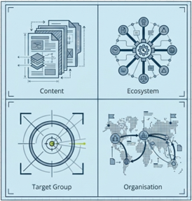 One of the most useful frameworks in the presentation was the model of four visibility dimensions: content, ecosystem, target group, and organisation. This framework helps explain why there is no one-size-fits-all formula for digital success in the IP market.