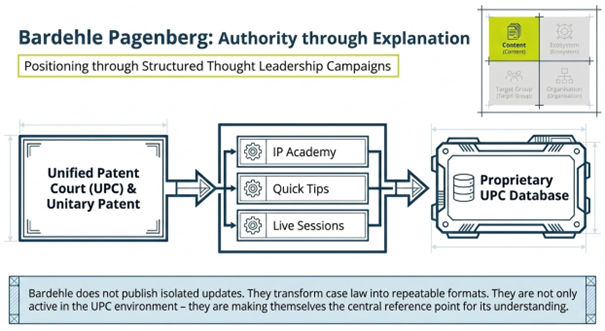 Bardehle Pagenberg represented authority through explanation. The firm’s visibility grows not through isolated updates, but through structured thought leadership around a core issue such as the Unified Patent Court and the Unitary Patent. In this model, content is not treated as occasional commentary. It becomes a repeatable format. Education becomes a positioning tool. The firm does not merely react to developments. It becomes a central reference point for understanding them.