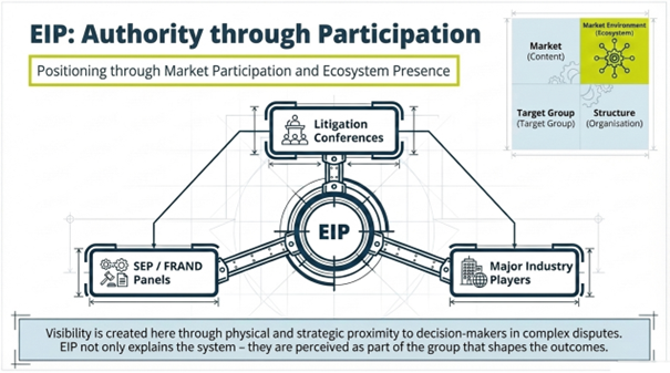 EIP illustrated authority through participation. Here the decisive factor is proximity to the market environment. Visibility emerges through participation in litigation conferences, SEP and FRAND panels, and strategic closeness to major industry players. In this model, the market does not perceive the firm only as an observer explaining the system. It begins to see the firm as part of the group shaping outcomes inside that system.