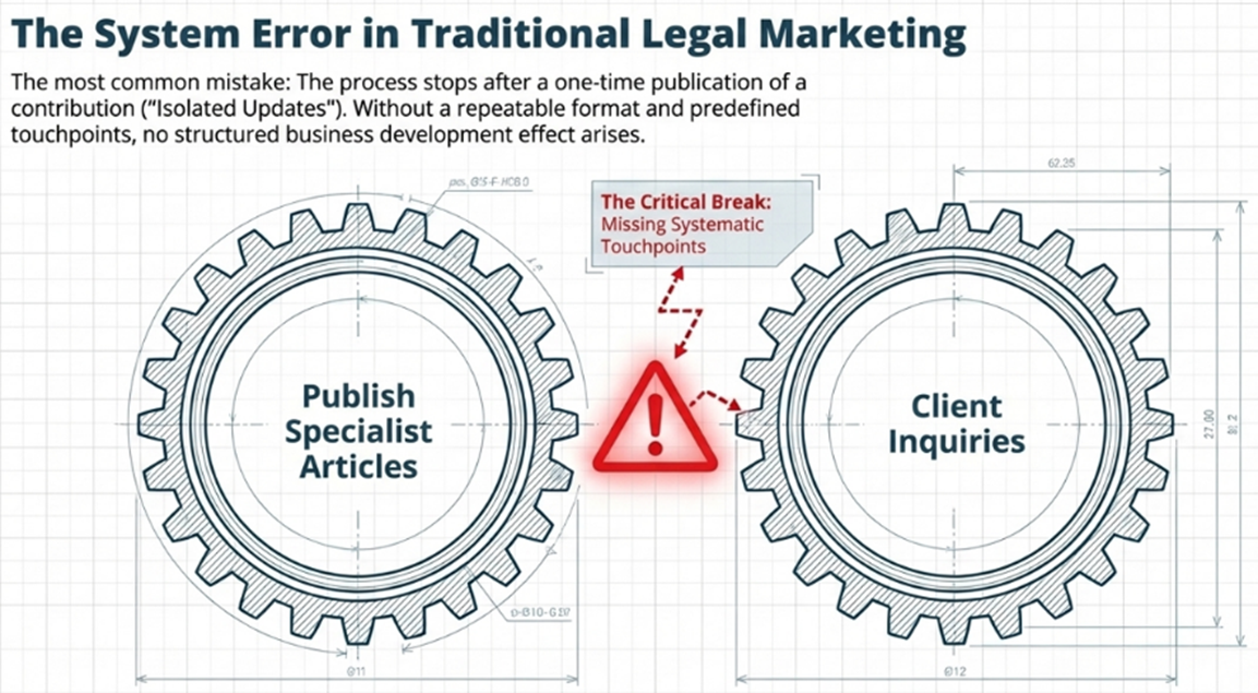 This image is highly convincing because many firms can recognise themselves in it. They invest considerable intellectual effort into a publication, a talk, or a legal update, but then treat the output as complete in itself. From a marketing perspective, however, the real issue is what happens after publication.