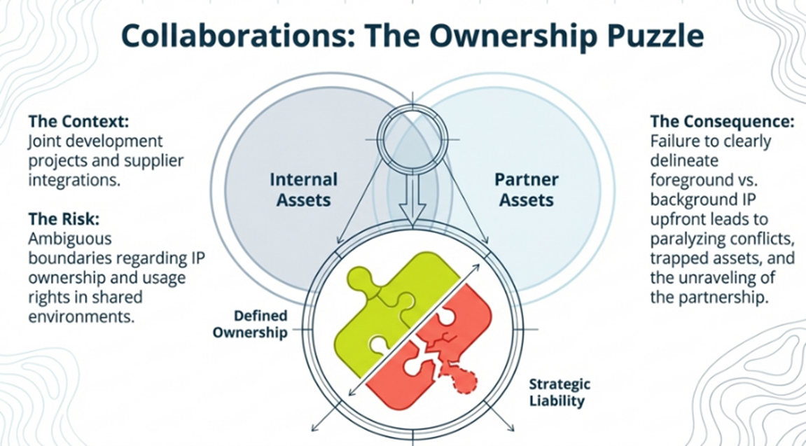 The key challenge is that collaboration depends on openness, while IP protection depends on selective control. If that tension is not managed consciously, companies face information leakage, unclear ownership, conflicting expectations, and later disputes over use rights, improvements, and commercialization.