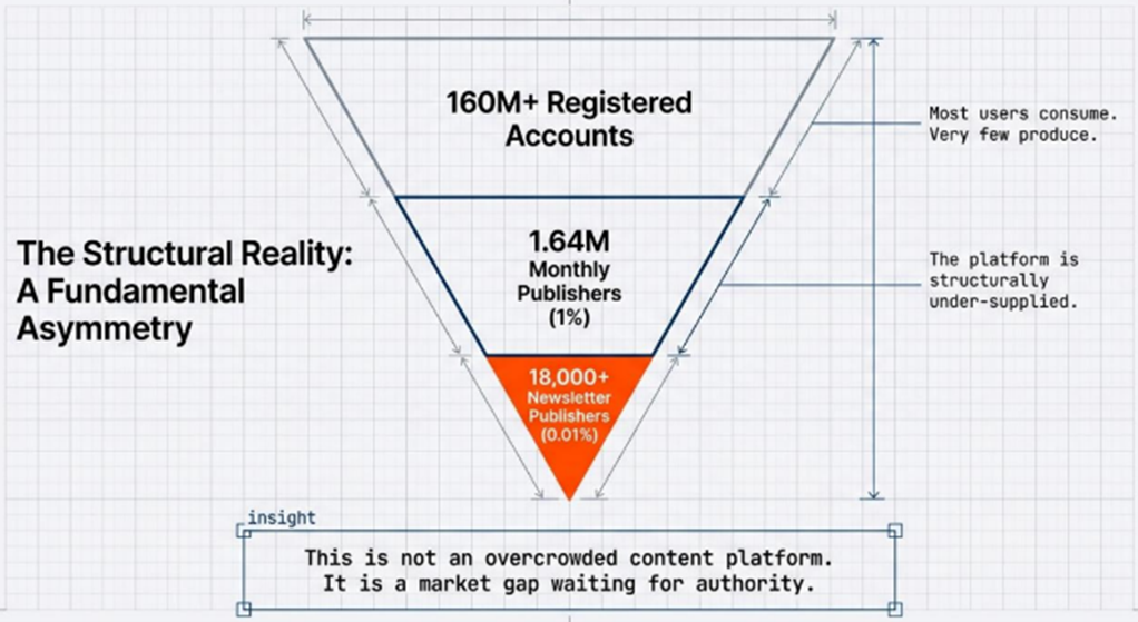 A slide early in the deck visualized a basic asymmetry: many registered accounts, but only a small minority publishes regularly, and an even smaller fraction publishes higher effort formats such as newsletters. The conclusion was optimistic: the platform is structurally under supplied with specialized, useful authority. If you publish for a clear audience, you are filling a gap rather than shouting in a crowd.