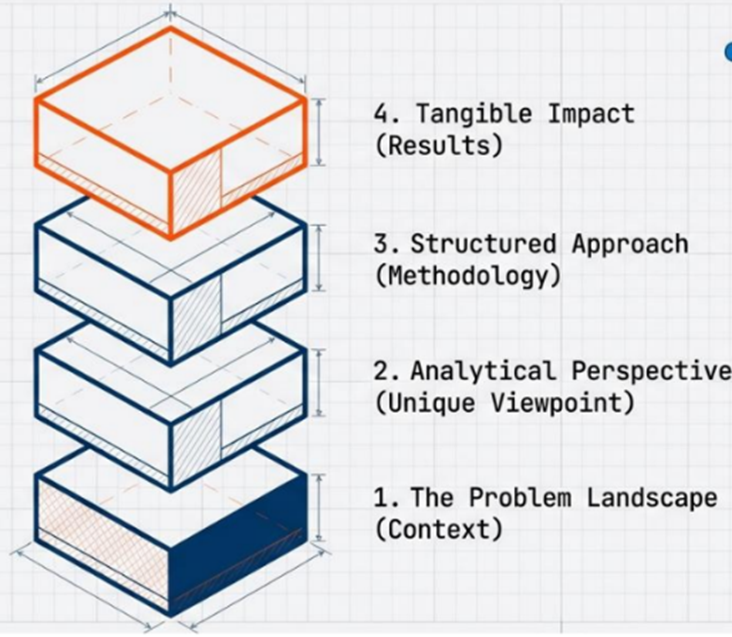 The “About” section was presented as a strategic narrative in four parts: context (the problem landscape), your viewpoint (what you see that others miss), your methodology (how you work), and your impact (results). The instruction was to avoid biography and instead answer the reader’s silent question: “What can this person do for me, and how will it work?”