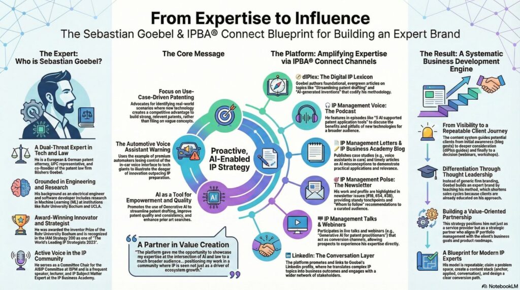 If you can show what you know, you make it easier for clients to choose what you can do. Few experts embody this better than Sebastian Goebel, European & German patent attorney and co-founder of Bösherz Goebel, whose specialty sits at the intersection of software, AI, and portfolio strategy. On IPBA® Connect channels and the IP Business Academy, Sebastian’s positioning is a blueprint for IP experts who want to convert reputation into relationships—consistently and without “hype cycles.”